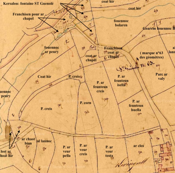A partir du lieu-dit Keringall qui est en fait ce qui reste du Manoir de Keringar, l’ancienne allée de ce manoir, descend vers l’aber. Le plan du cadastre de 1840, nous montre , en bas, après un virage à gauche, près du ruisseau, l’emplacement de la fontaine Saint-Guénolé et des terrains dont les dénominations font référence à la chapelle du même nom.