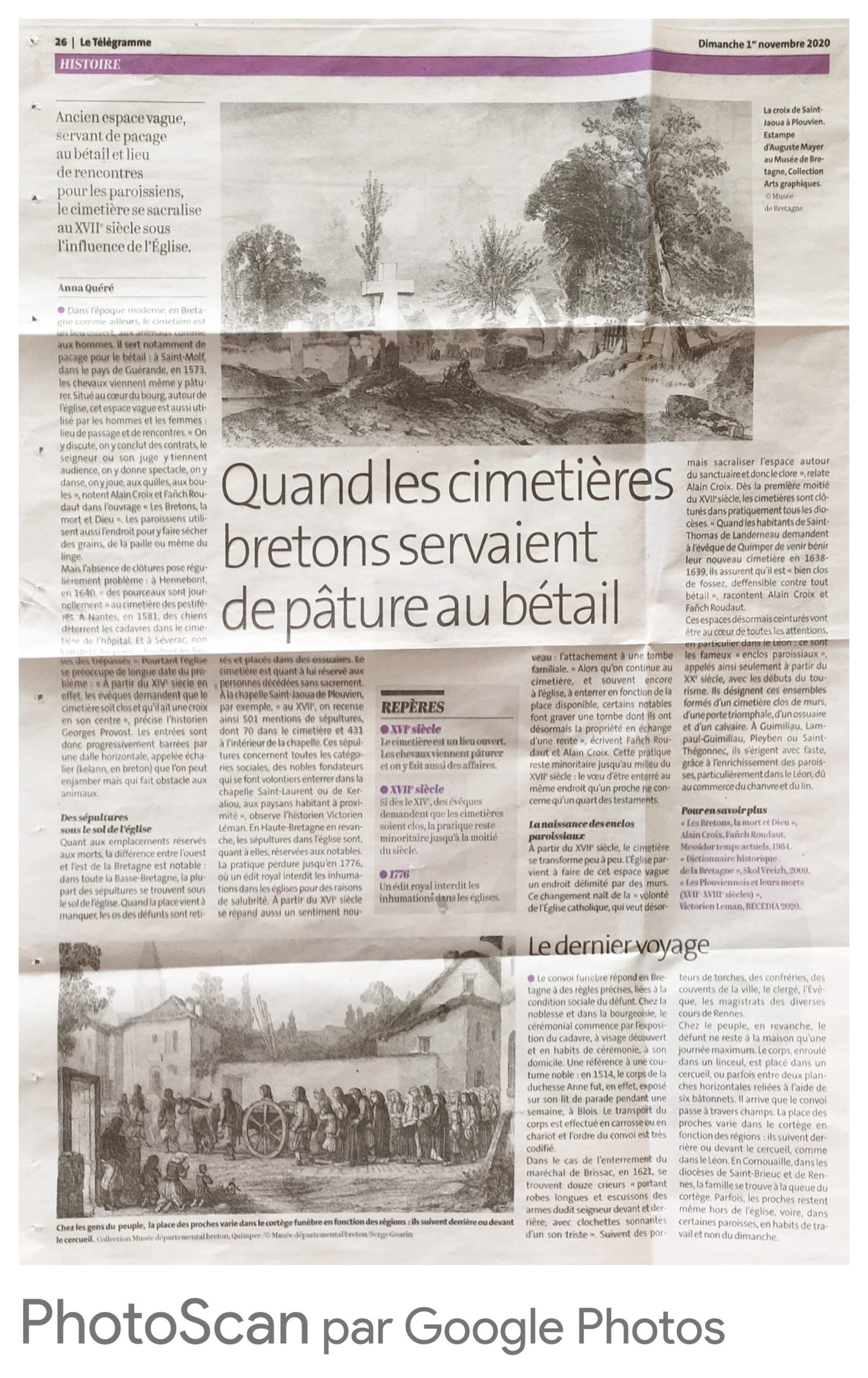 La méprise a pu être facilitée chez les lecteurs du Télégramme, en lisant l’article d’Anna Quéré daté du 1er novembre 2020, intitulé ” Quand les cimetières bretons servaient de pâture au bétail “. La gravure en question sert en effet d’illustration à l’article. Ce choix est graphiquement judicieux mais la reproduction de la légende erronée a pu induire en erreur.